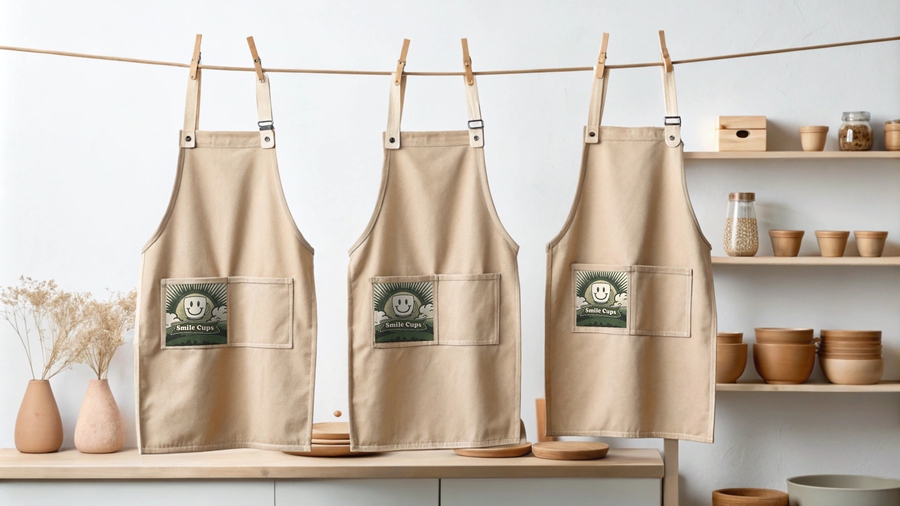 Модель: Recraft Фильтр: Village Realism Промпт: Take a beige aprons for working with clay with logo; take a few white mugs with logo.