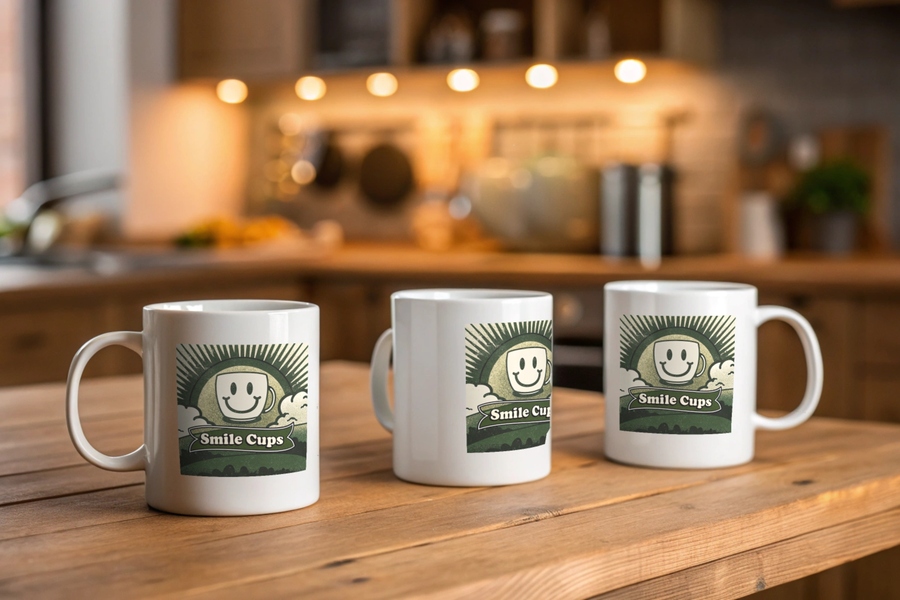 Модель: Recraft Фильтр: Village Realism Промпт: Make a logo for the ceramic mug store «Smile cups» Мокап: Good Mockups.