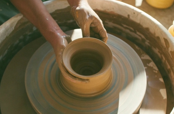 Модель: Recraft Фильтр: Village Realism Промпт: Take a photo where people make clay mugs; take a similar photo where a girl makes a clay cup; take a photo where make a cup on a potter’s wheel; take a photo where there are 2 clay mugs with faces and different tools on the table.