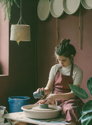 Модель: Recraft Фильтр: Village Realism Промпт: Create a photo where a European family makes clay mugs with faces in a bright boho-style office