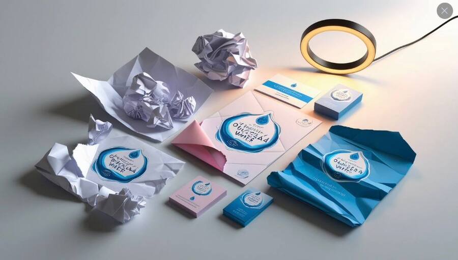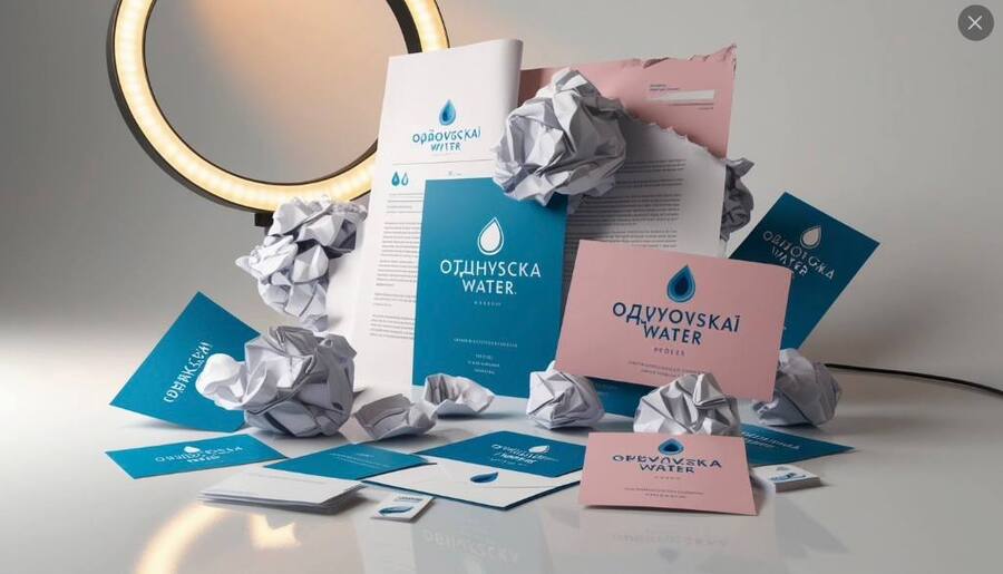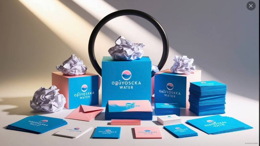 imagine: creating a layout of printed materials (paper, envelope, business cards) on a white background for the Обуховская water brand using pink and blue colors. https://app.leonardo.ai/?via=1222&ga