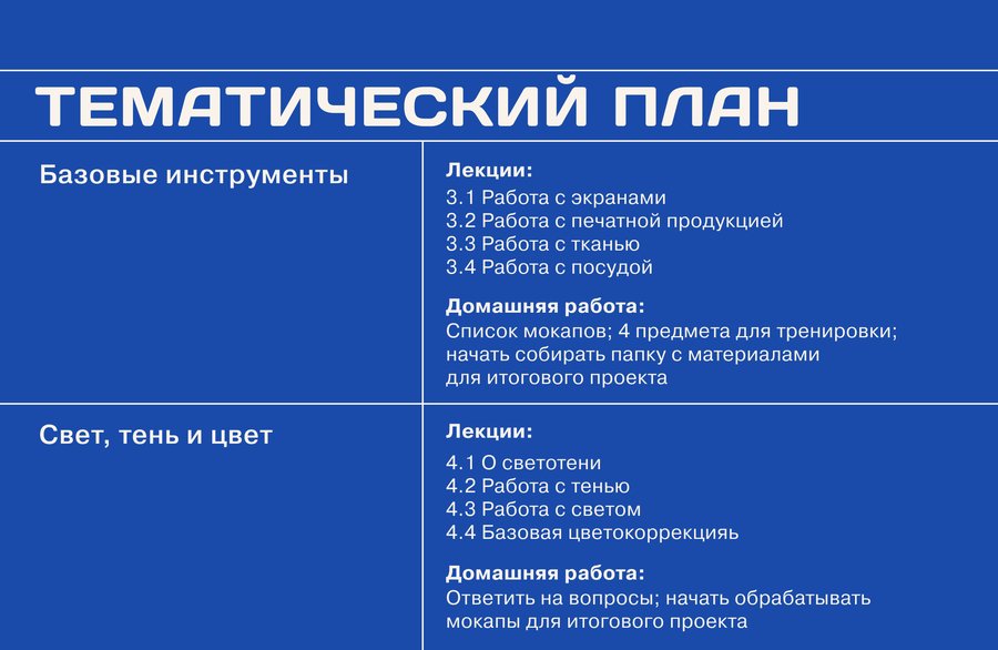 В рамках курса слушатели получат общее представление об этапах работы: знакомство с инструментами, обработка исходных изображений, создание реалистичных светотеневых эффектов и подготовка файлов для портфолио.