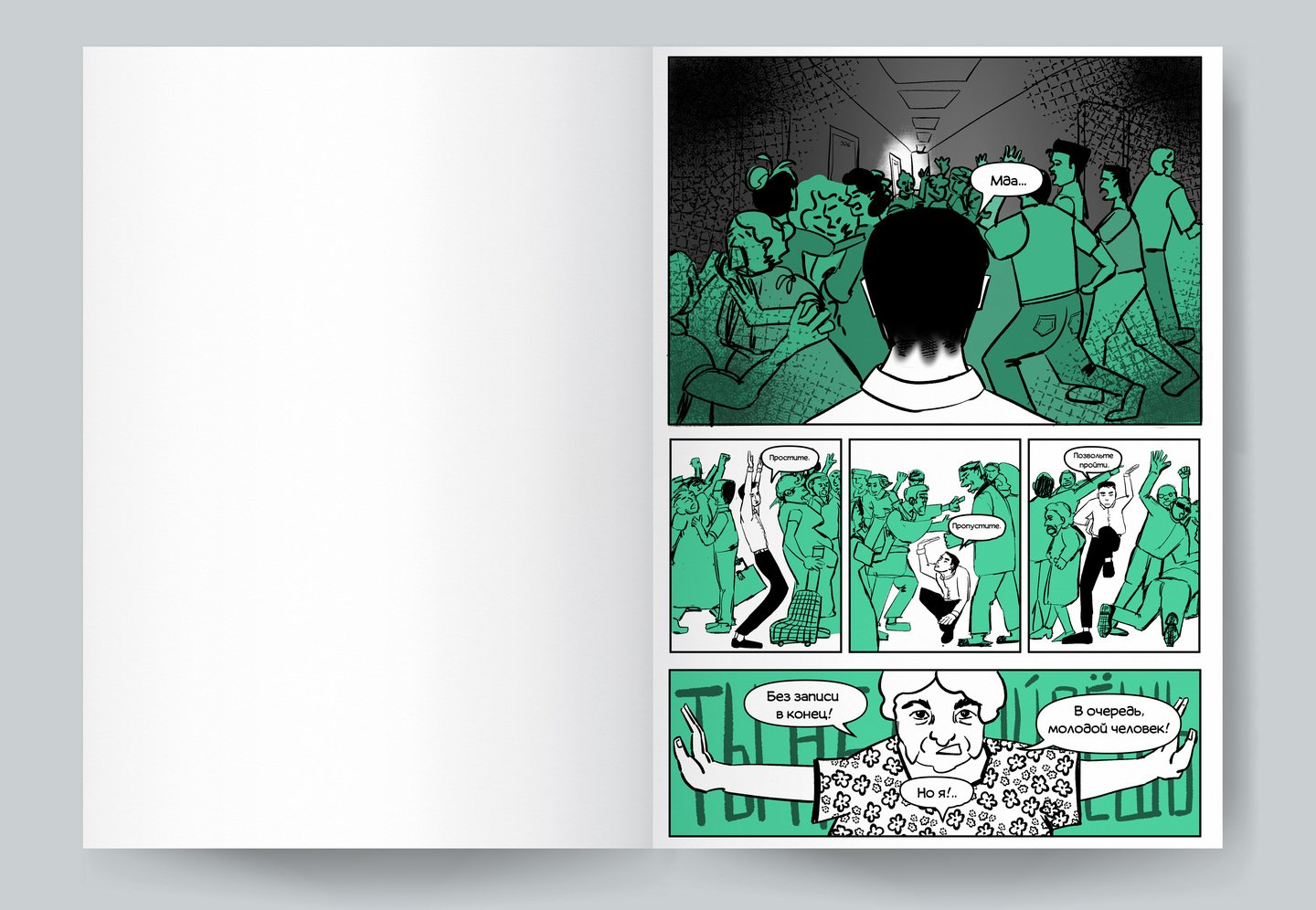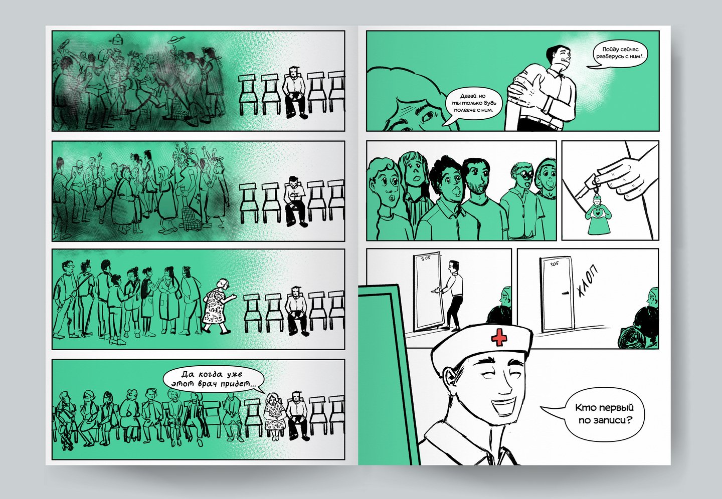 Комикс про забавный случай в больнице, когда самому врачу приходится встать в очередь, чтобы попасть в свои кабинет. А так же специально разработанные стикеры по мотивам комикса.