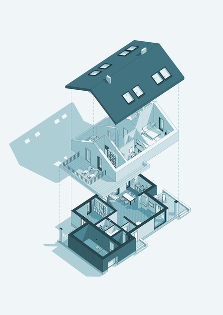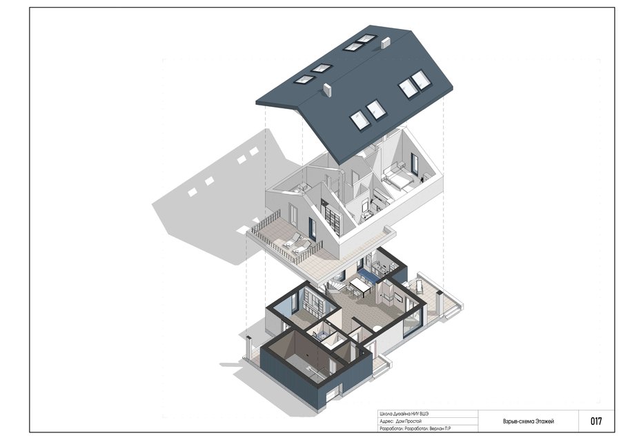 Коттедж «Простой» представляет собой двухэтажную постройку со скатной кровлей, общая площадь которого составляет 231 м².