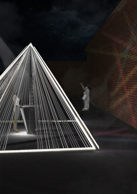 Инсталляция образует своеобразный шатер, внутри которого стоит мини-постамент, где лежат ленты из шифона разного цвета; каждый цвет символизирует ту или иную творческую профессию (архитектор/дизайнер/художник/фотограф/модельер/писатель и тд). Гость, попадающий в этот шатер, может выбрать ленту цвета, который соответствует его виду деятельности и повязать на ребра этой призмы (аналогия с деревом желаний). В конце фестиваля можно будет проследить, ленты какого цвета преобладают и сделать вывод, представителей каких сообществ больше посетило мероприятие (своеобразное соревнование). Поскольку ленты прозрачные, свет арки будет подсвечивать их и окрашивать арку в разные цвета. Также арка является неким переходом между зонами фестиваля: посетив инсталляции, посвященные воде/подводному миру Волги, гость «выныривает» из воды и попадает «на сушу», в зону фудкорта, пройдя сквозь призму