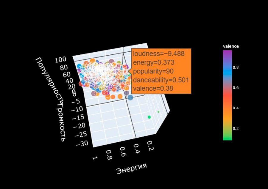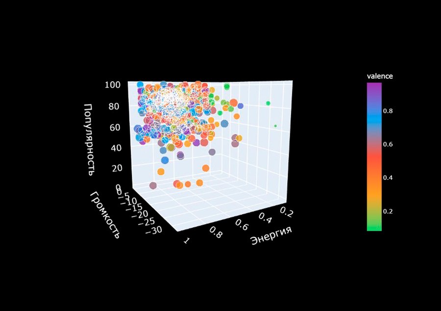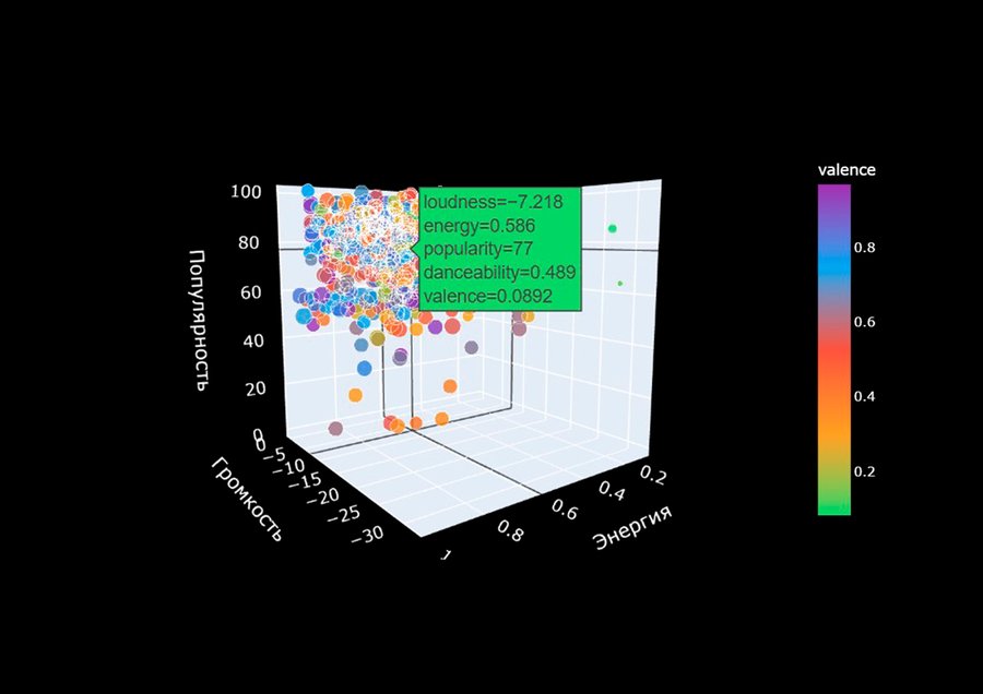 Благодаря диаграмме можно увидеть, как связаны loudness, energy и popularity. Цвет указывает на valence (эмоциональную окраску), а размер пузыря — danceability, насколько трек танцевальный.
