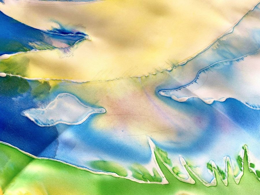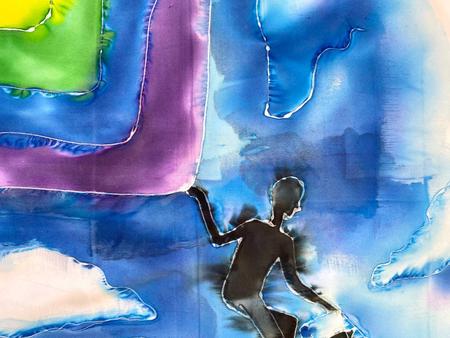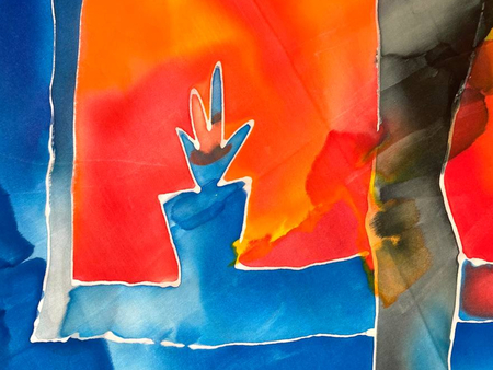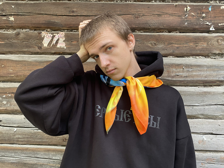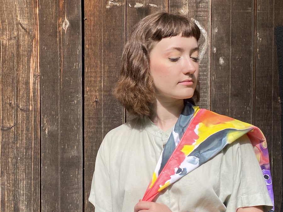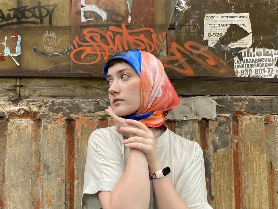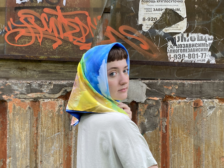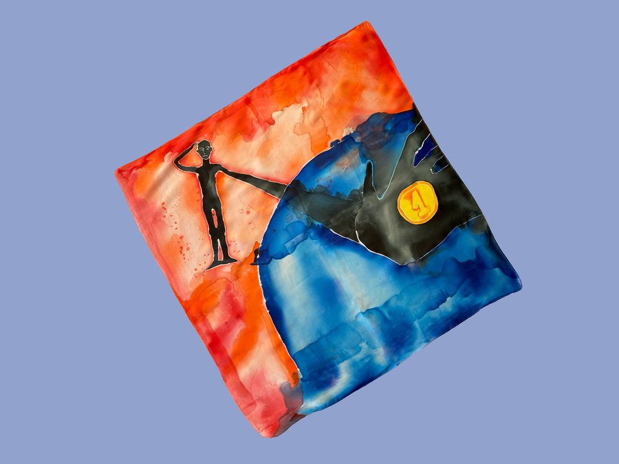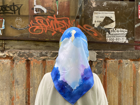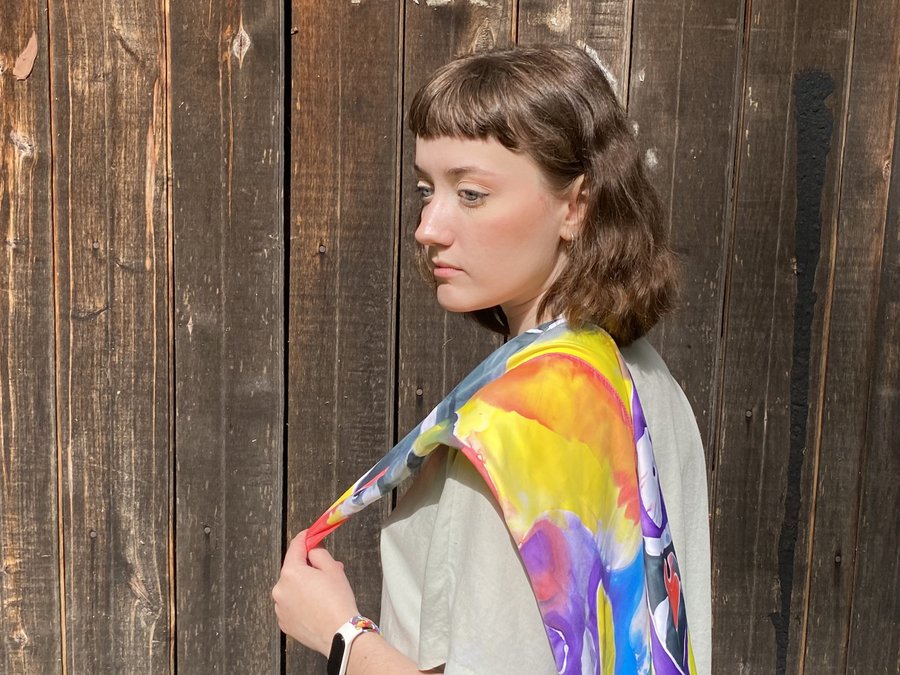 Чтобы передать связь «Гражданской обороны» с народной культурой, я выбрала платки — традиционный, но в то же время личный аксессуар. Техника холодного батика добавляет работе небрежности, в которой сочетается отсутствие контроля. Это очень похоже на звучание песен группы.