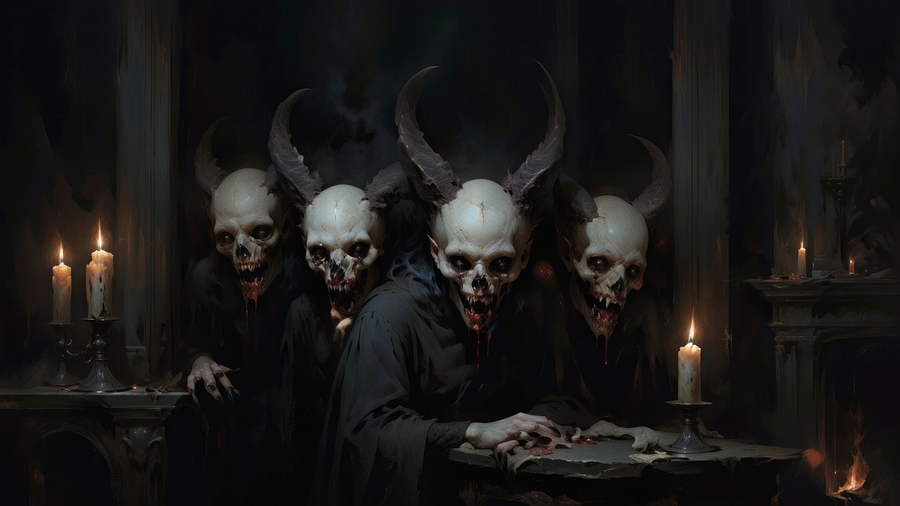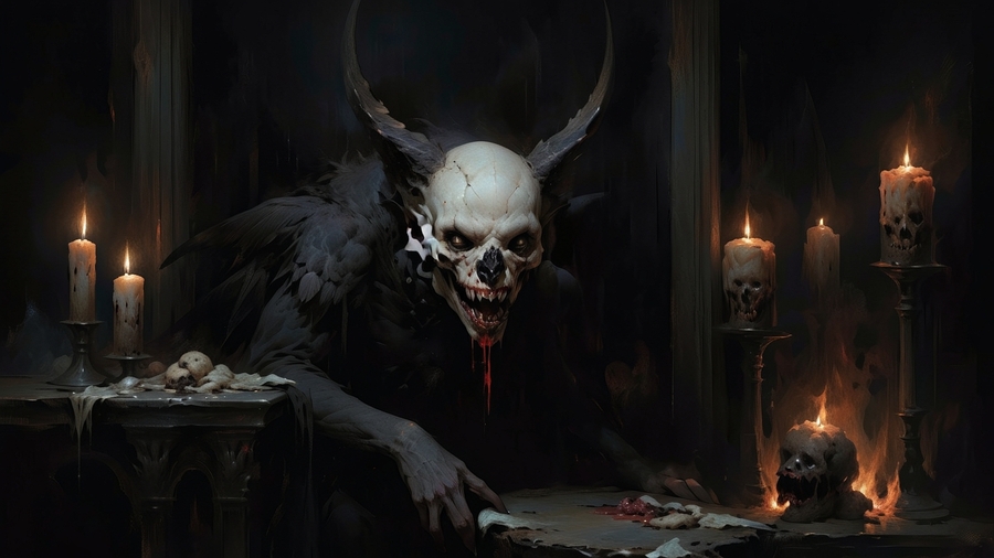 Промпт: «A manticore with black feathers and long horns stares angrily at the viewer. Its head resembles a withered human skull, and bloody saliva drips from its mouth. It is surrounded by the gray stone of a medieval castle and candles in which human faces are frozen.»