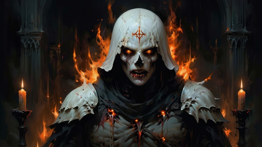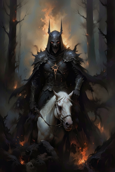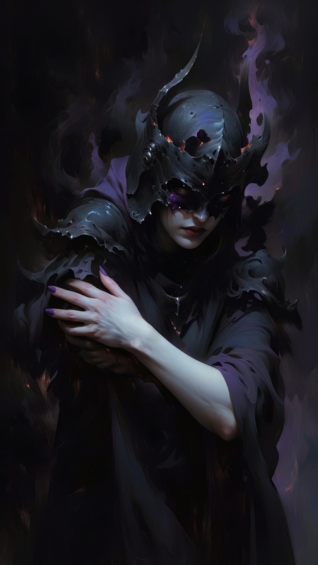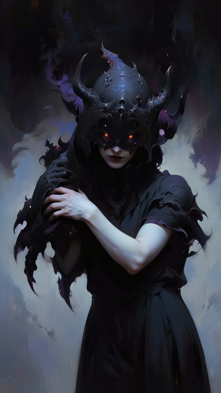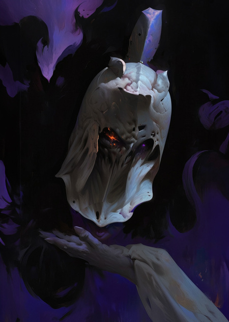 Также для всех генераций врагов был использован общий промпт для освещения, композиции, характера и стиля мазка: «Dark Arts Style», «PhotoReal», «Cinematic», «Wide Oil Brush Stroke», «High Rendered», «Chiaroscuro Effect», «Intense Atmosphere», «Subtle film grain and meticulous shading add depth and texture, emphasizing the emotional gravity of the scene. "