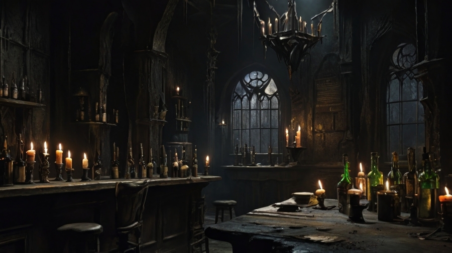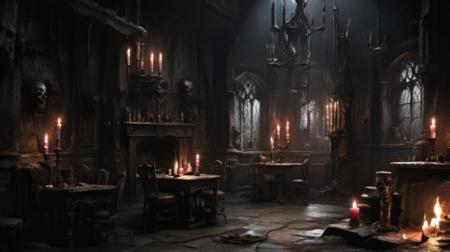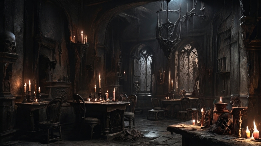Для всех локаций использовались одинаковые части промпта для композиции и освещения: «Bare location view, interior only.», «The dim light reflects», «Sense of mystery and danger».
