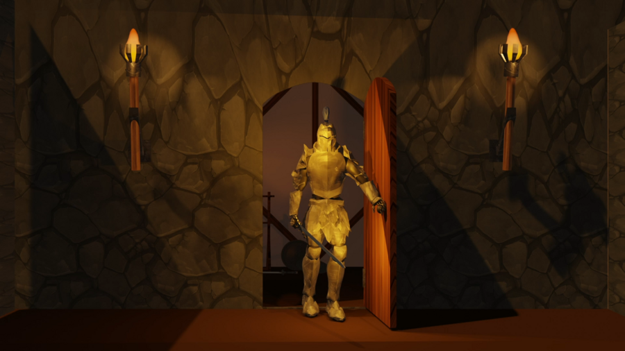 Промпт второго изображения копирует первый, но с добавлением части по фигурку: «Near the screen 3D figure is standing: it is a knight without a head, he holds his helmet and sword. Figure is made with black, gray and purple colors.».