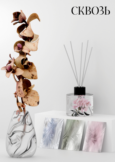 СКВОЗЬ — это линейка сувениров для музея, разработанная в рамках конкурса «Цветущий дворец». Она включает в себя следующие сувениры: футболка, заколки для волос, серия почтовых открыток, настенный календарь, детские леденцы на палочке и вазы для цветов.