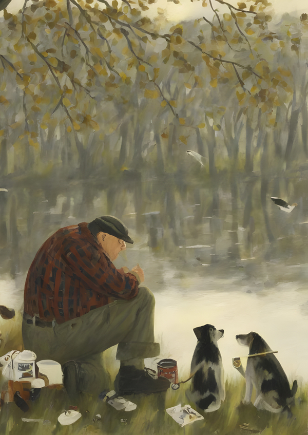 Изображение № 12: a paint in Gary Bant style, illustrating a peaceful morning by the lake, where a grandfather in a warm flannel shirt sips coffee from a tin cup, his old hound lying beside him, ears twitching at the sound of birds
