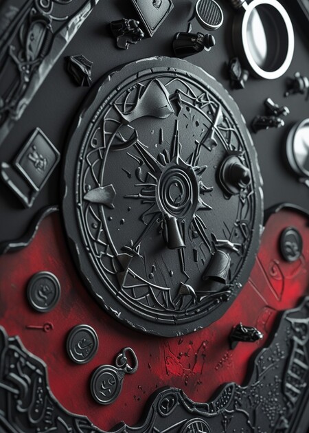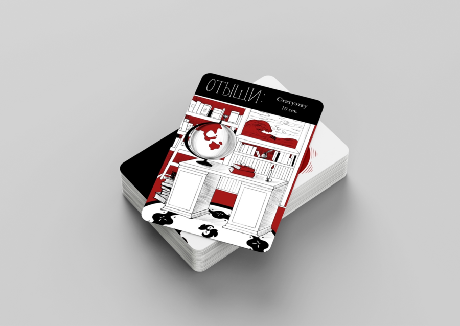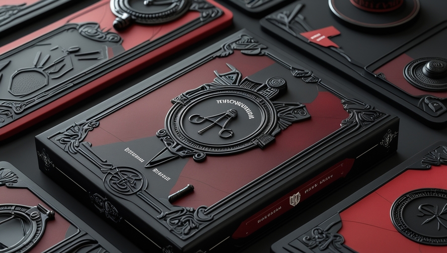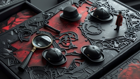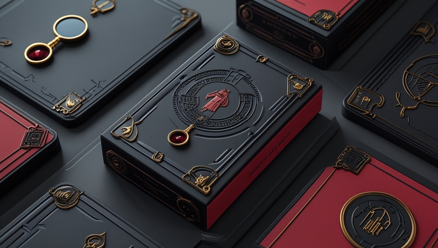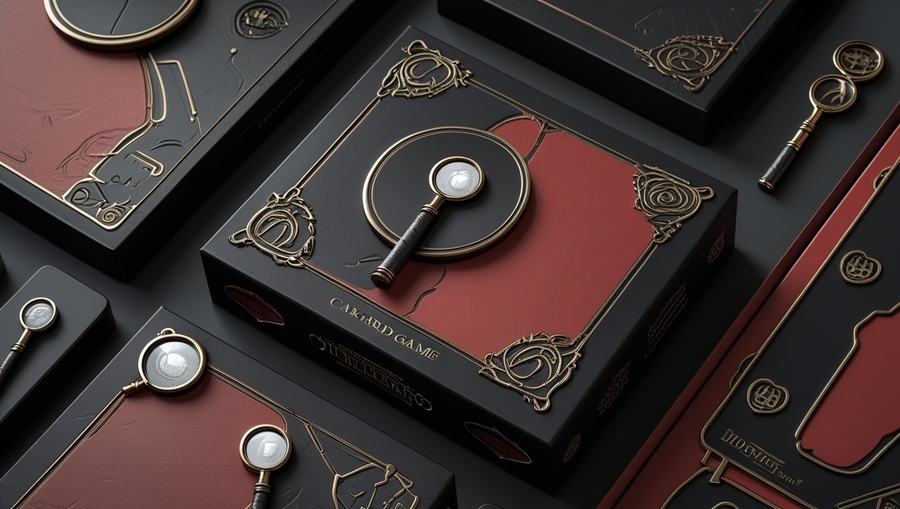 Promt: Packaging for card game, combining black, red and gray tones, there are detective ornaments on the packaging