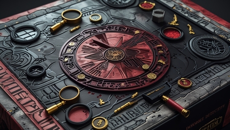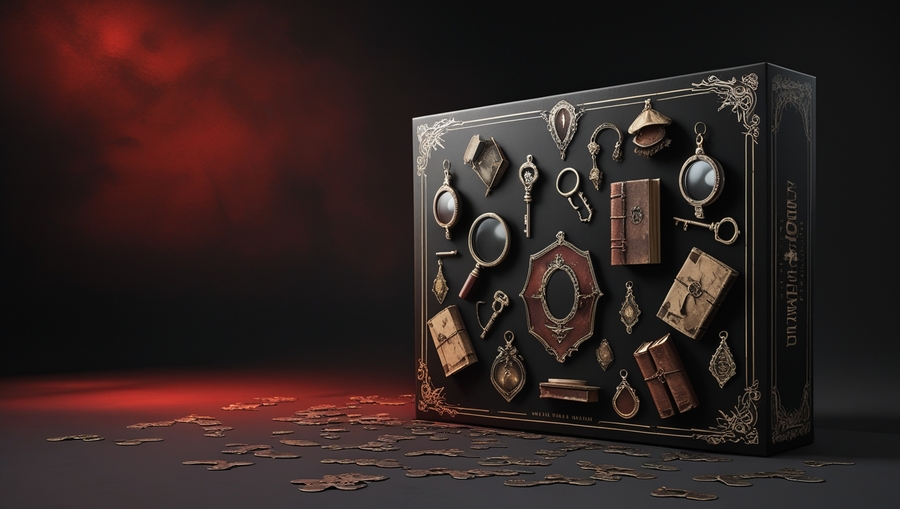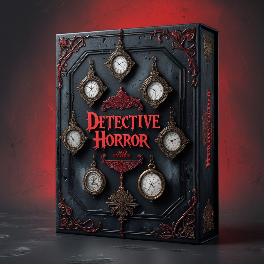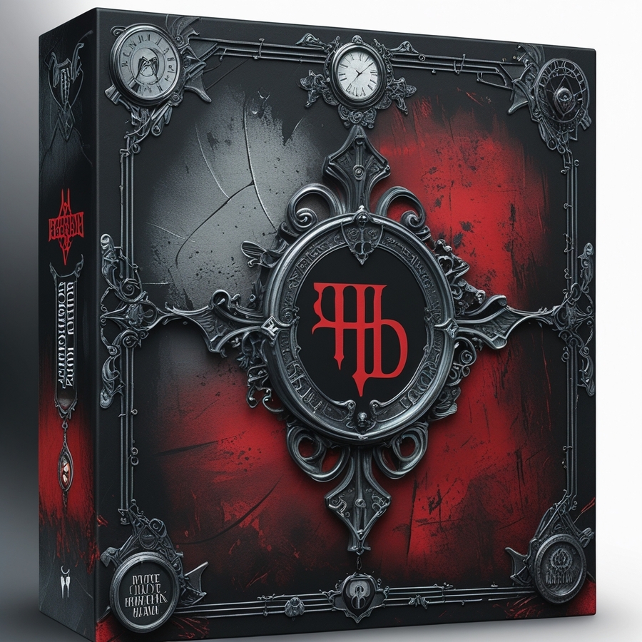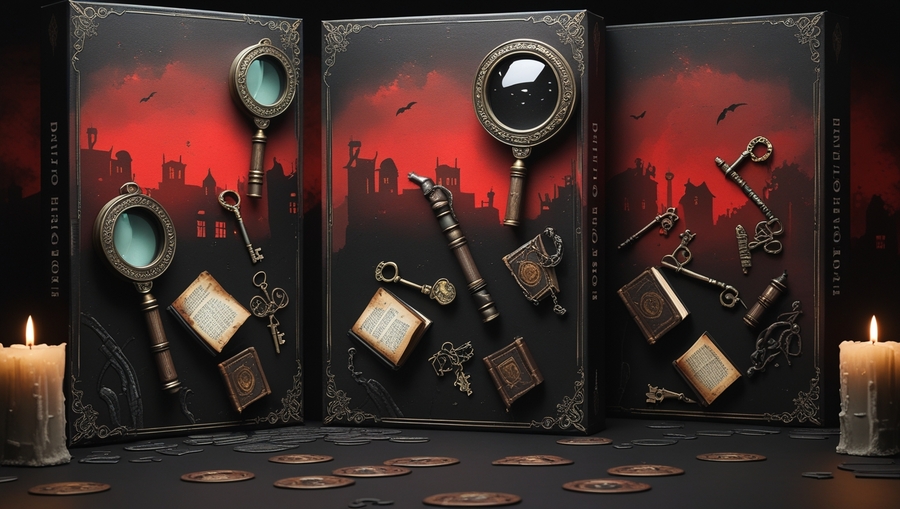 Promt: Packaging for board horror games, combining black, red and gray tones. There are detective ornaments on the packaging.