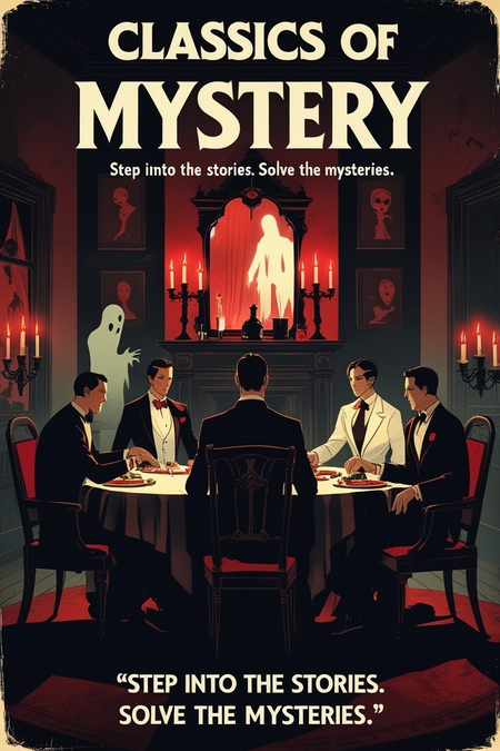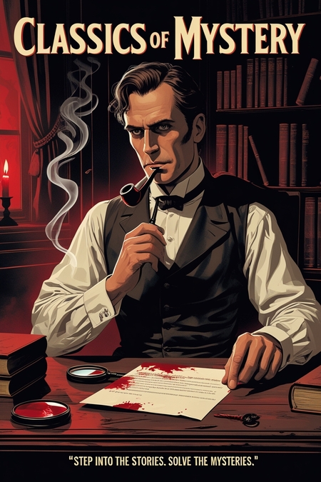 Promts: vintage-style poster for a company called «Classics of Mystery», A 1920s train carriage interior, where elegantly dressed characters sit around a table, engaged in a tense game while shadows of unseen figures loom in the background. The scene is dramatic, with warm lighting contrasting dark tones. Color palette should use deep blacks, crimson reds, and subtle sepia or gray tones, emphasizing suspense, intrigue, and a connection to classic detective and horror aesthetics. Poster should include the tagline: "Step into the stories. Solve the mysteries.» vintage-style poster for a company called «Classics of Mystery», A dark Victorian study with a smoking pipe, magnifying glass, and a bloodstained letter on a wooden desk. The background is dimly lit with a bookshelf and faint candlelight, evoking mystery. Color palette should use deep blacks, crimson reds, and subtle sepia or gray tones, emphasizing suspense, intrigue, and a connection to classic detective and horror aesthetics. Poster should include the tagline: "Step into the stories. Solve the mysteries.»