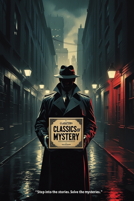 Promts: Vintage-style poster for a company called «Classics of Mystery», A noir-style city alley with rain-soaked streets, where a figure in a trench coat and hat holds a game box marked with «Classics of Mystery.» The atmosphere is moody and cinematic, with deep shadows and glowing streetlights. Color palette should use deep blacks, crimson reds, and subtle sepia or gray tones, emphasizing suspense, intrigue, and a connection to classic detective and horror aesthetics. Poster should include the tagline: "Step into the stories. Solve the mysteries.» Vintage-style poster for a company called «Classics of Mystery», A haunted mansion dining room with characters in formal attire playing a tabletop game. The setting includes eerie details like flickering candelabras, a cracked mirror, and faint ghostly silhouettes. Color palette should use deep blacks, crimson reds, and subtle sepia or gray tones, emphasizing suspense, intrigue, and a connection to classic detective and horror aesthetics. Poster should include the tagline: "Step into the stories. Solve the mysteries.»