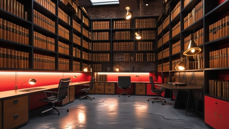 Promt: Loft-style and modern office, dominated by brown, black and red shades, with some shelves of books