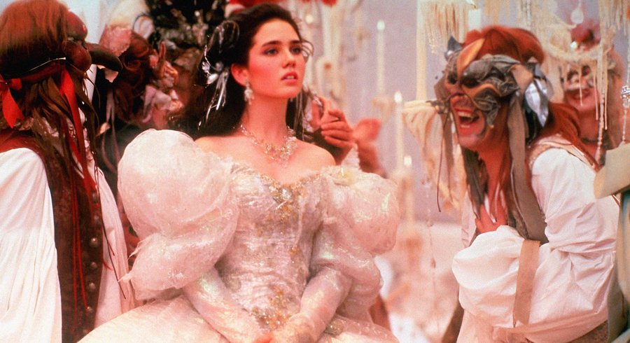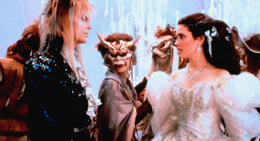Похожими же элементами обладало и другое платье. В фильме «Лабиринт» главная героиня оказывается на балу, она окружена его гостями, которые наряжены в пиратские костюмы и маски. Сама девушка одета в большое белое платье с пышными рукавами. Оно сверкает и переливается в огнях маскарада. Таким образом, новые романтики в этом кино воплощены в виде героев сказок.