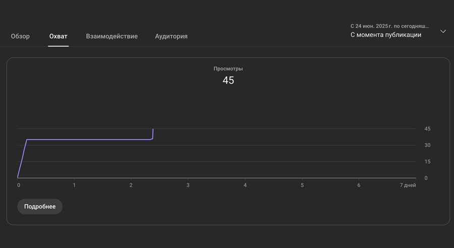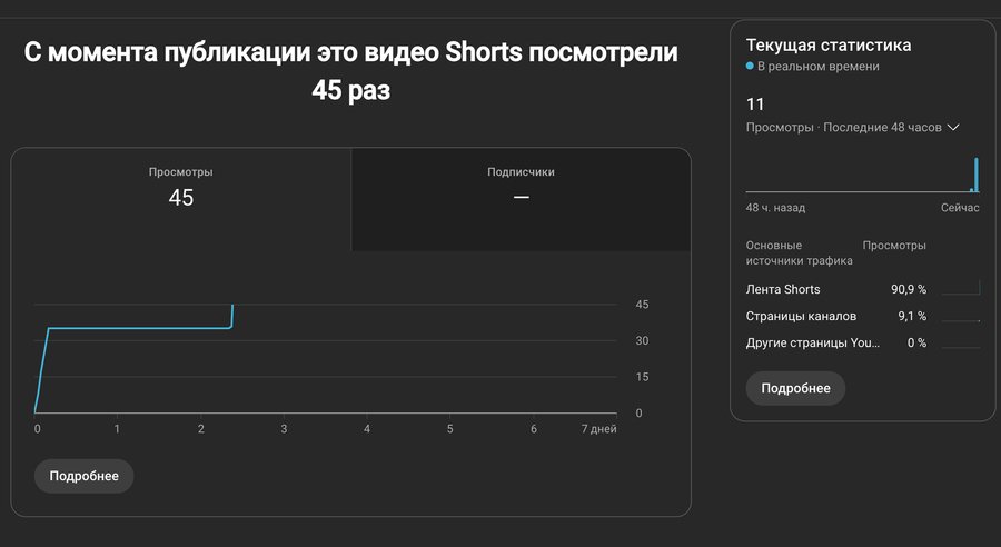 На YouTube Shorts: — Видео посмотрели всего 45 раз. — Не было вообще никакой вовлечённости.
