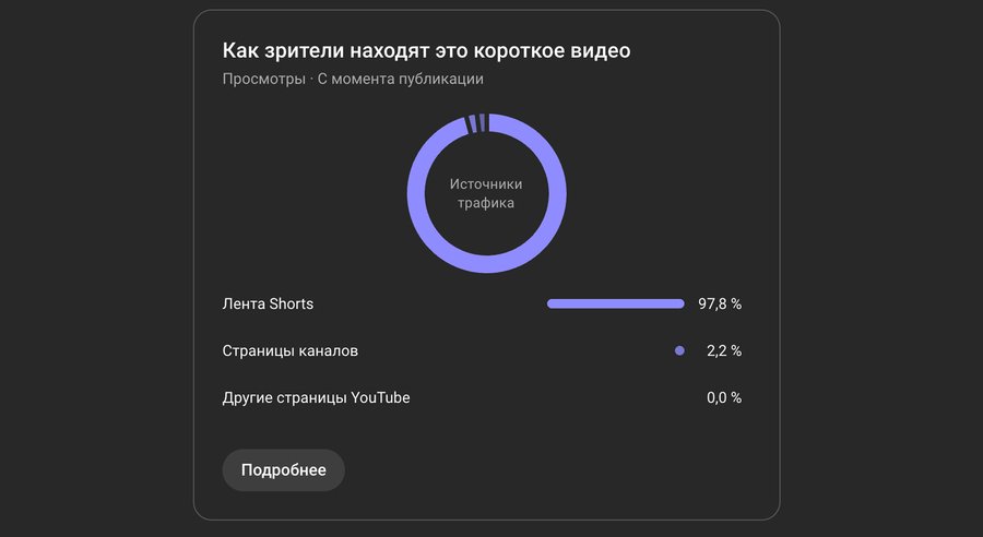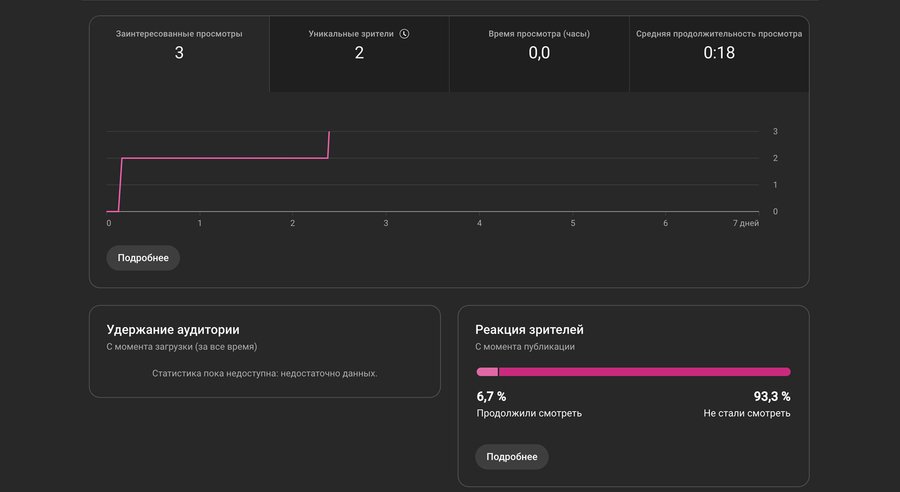 YouTube Shorts, по данным, почти не сработал. Скорее всего, причина в том, что формат короткого видео оказался не очень подходящим или плохо попал в алгоритмы — возможно, не хватило качественной обложки, сильного хука в первые секунды, или аудитория не восприняла тему.