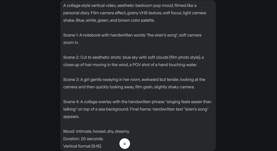 Для того чтобы понять что именно мне нужно сделать, я попросила у нейросети проанализировать текст песни, прописала планируемую визуальную эстетику сингла, целевую аудиторию, принцип коммуникации с целевой аудиторией, ценности, которые я бы хотела донести. Из этого длинного запроса, сеть выдала мне предполагаемый сюжет для «клипа», описав элементы в него входящие как сцены.