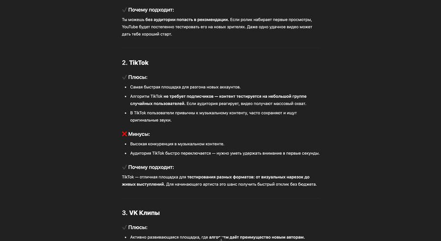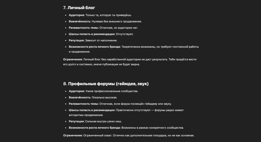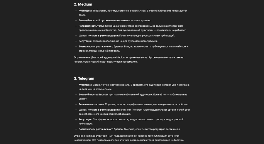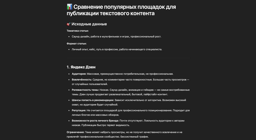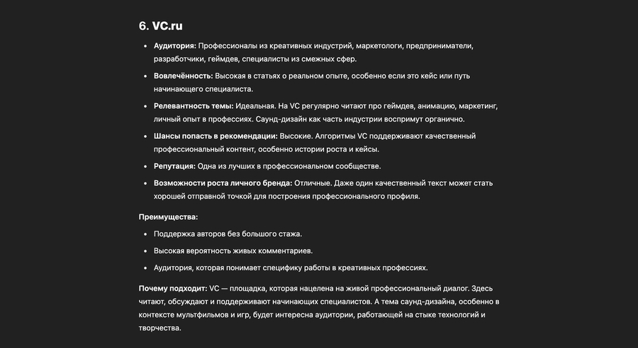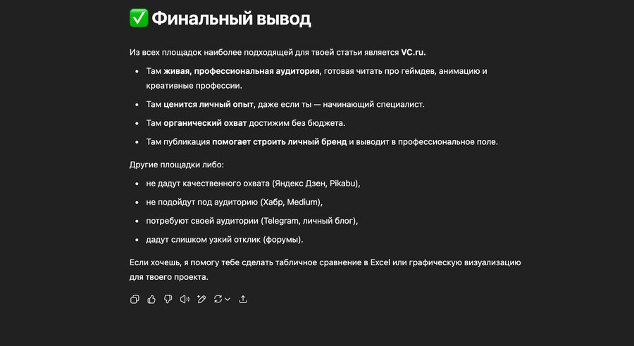 С помощью GPT-чата, я просмотрела специфику статей на предложенных в задании сайтах, и попросила генеративную модель подобрать наиболее подходящий сервис для размещения исходя из целевой аудитории веб-страницы и моего текста. В итоге для размещения статьи я выбрала VC.ru
