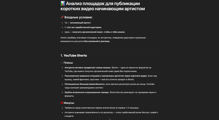 В рамках работы над проектом я активно использовала GPT-4o для генерации текстового контента и тегов, первичного анализа платформ для публикаций, исправления промтов для достижения лучшего качества картинок, которые я генерировала и анимировала в Pika Labs, Runway Gen-2.
