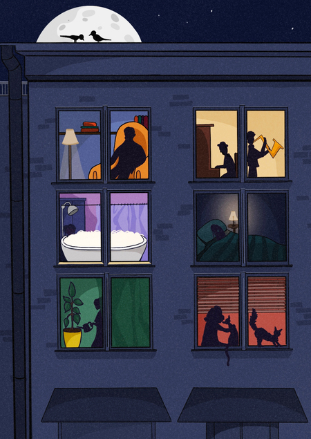 Первая иллюстрация приоткрывает завесу тайны личной жизни, отражает привычные вечерние занятия обычных людей, их ритм жизни и увлечения.
