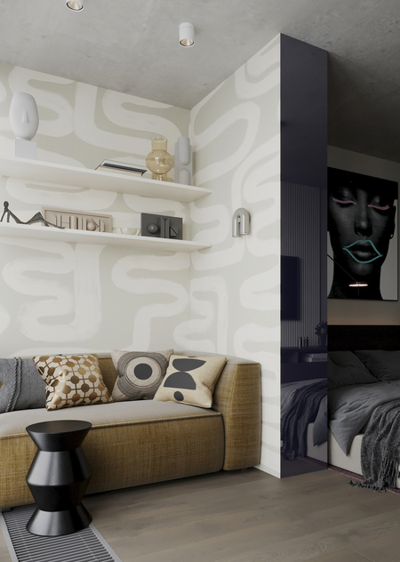 Визуализация дизайн проекта современной квартиры-студии. Дизайнер проекта — Твердов Николай. Проект отличают: лаконичность форм интерьера, гармония светлых и темных оттенков, приглушенное освещение данного помещения.