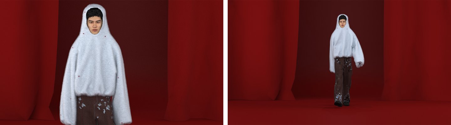 «СНЕЖОК» — ласковое название проекта, центральным образом которого стал оказавшийся в сугробе человек. Это теплое воспоминание о холодных и снежных днях прошлого, о зимнем праздничном настроении. Образ состоит из пушистого худи, украшенного красными бусинами, и из джинсов с глиттерной аппликацией. Дополняет образ сумка-снежок.