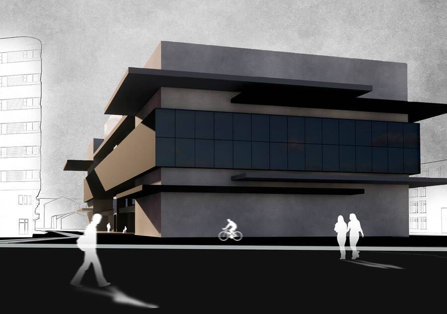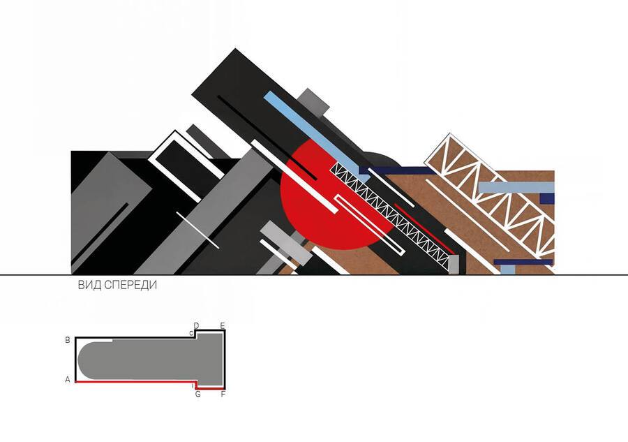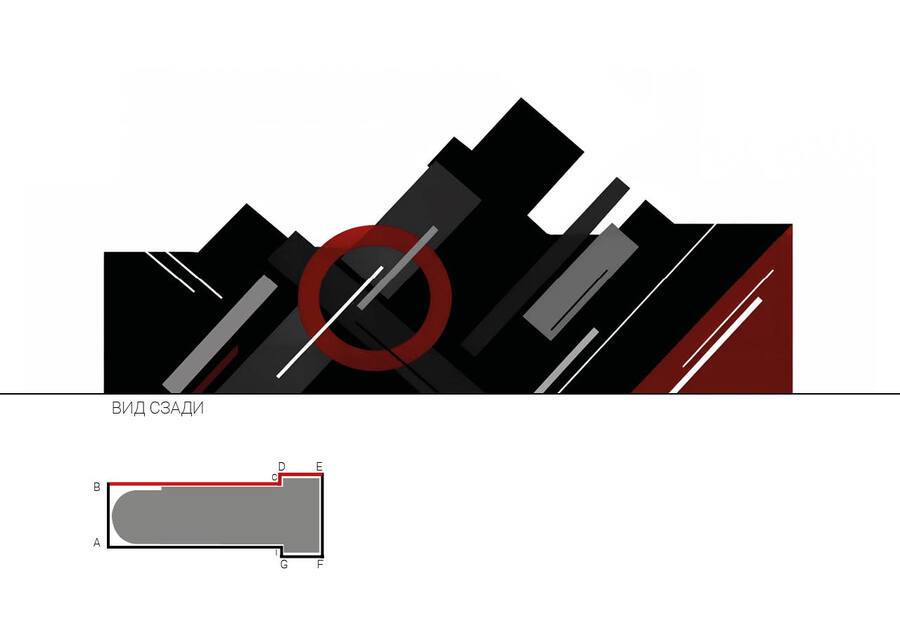 Проект трибуны для площади, разработанный Ильей Чашником в 1920 году, был высоко оценен Лисицким как значительный шаг вперед в области архитектуры. После этого Илья Чашник начинает искать свой уникальный «почерк» в супрематизме, что приводит его к новому художественному направлению, существенно отличающемуся от первоначального. Графический фасад отображает столкновение этих стилей.