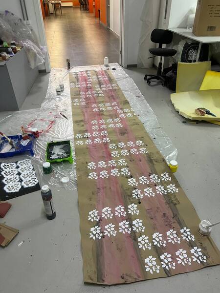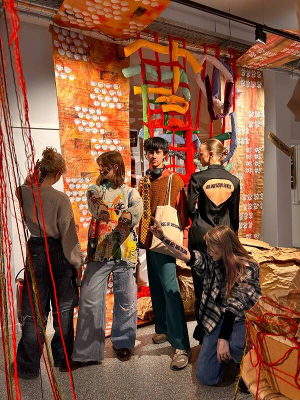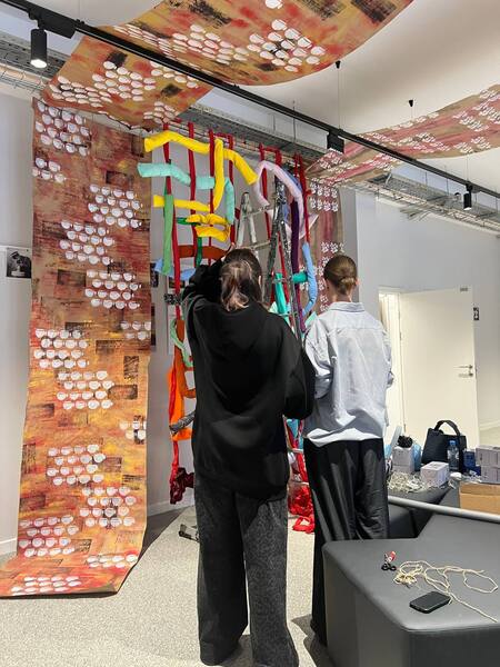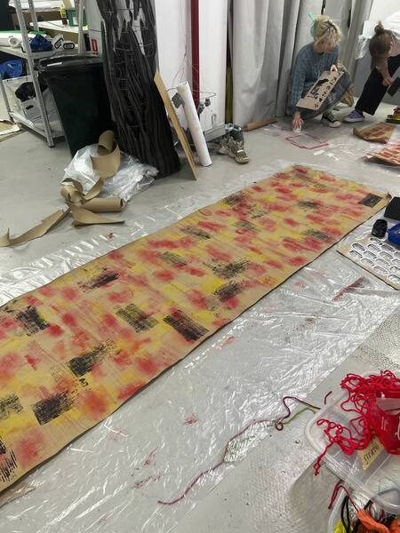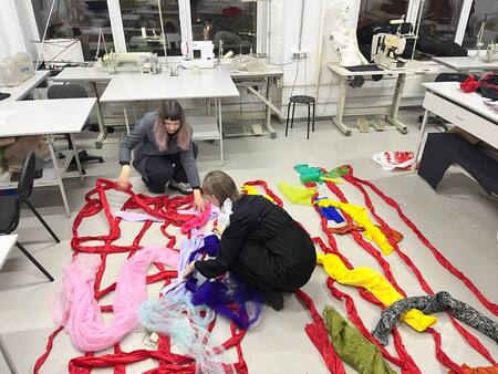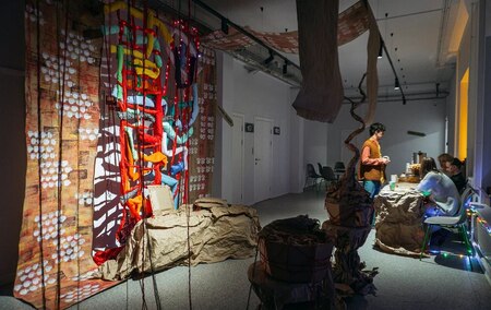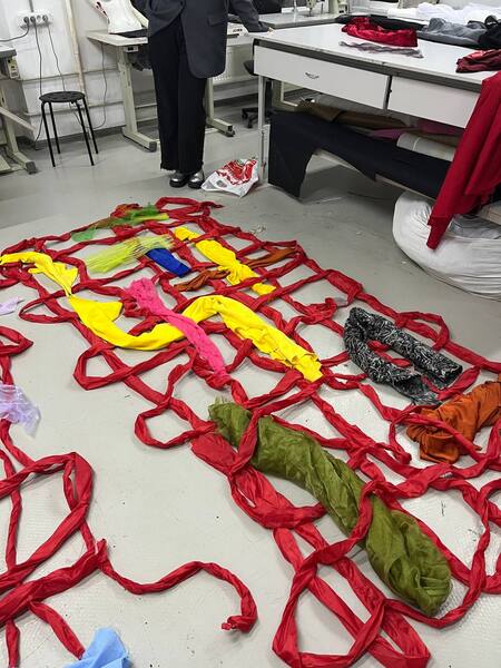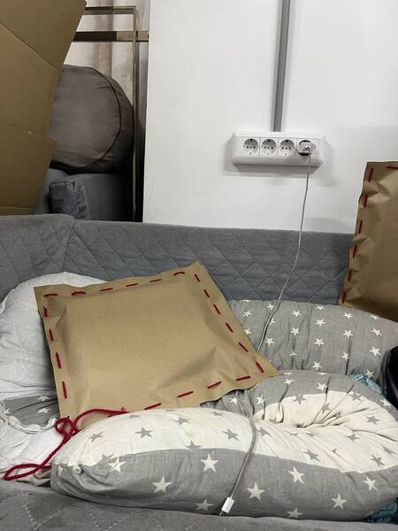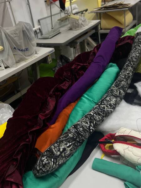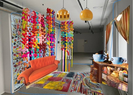 Чтобы достигнуть всех параметров, мы рассмотрели идею взять за основу ковры и множество красок, паттернов. Мы построили некую систему из ткани, где прослеживались мотивы из сериала, отшили ленты из ткани и наполнили их синтепоном для создания объемного ковра. Чтобы появился дополнительный свет для более уютного пространства, в основе лежали светящиеся ленты.