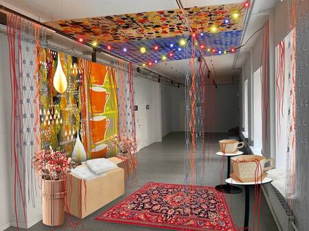 Также для большей связи с кафе из сериала и нашей локацией мы решили добавить гипорболизированные элементы: чашки с паром и вытекающим напитком, вывеска, подушки. Так как квинтэссенцией была ковровость пространства, во все детали были добавлены нити, пряжа.