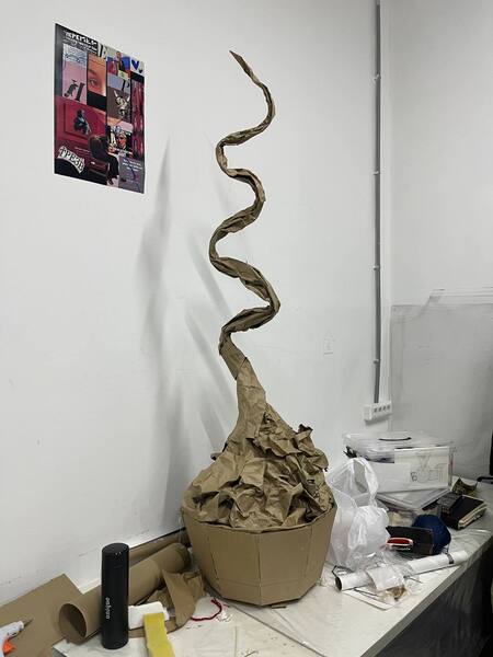 Обсуждая с командой возможности, локацию и концепцию сериала, мы решили оформить реквизит под крафт, использовать исключительно бумагу, картон. Перед нашей командой, работающей с кафе, стояла задача создать уютное, немного «гаражное», захламленное место. Опираясь на картинку из самого сериала, мы подчеркнули обилие паттернов, ковров, цветочных мотивов, теплого света и дополнительных цветных источников освещения. Основные цвета: красный, черный, желтый.