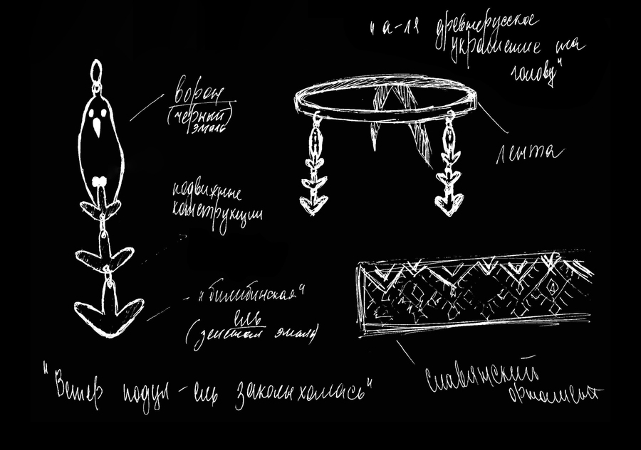 Данная ювелирная коллекция содержит в себе четыре предмета: украшение на голову, два кольца и подвеску. Я попыталась переосмыслить по большей части известные орнаменты живописца. Они играют неотъемлемую роль, являются важным составляющим почти всех его работ, но, к сожалению, так или иначе, не всегда бывают замеченными.