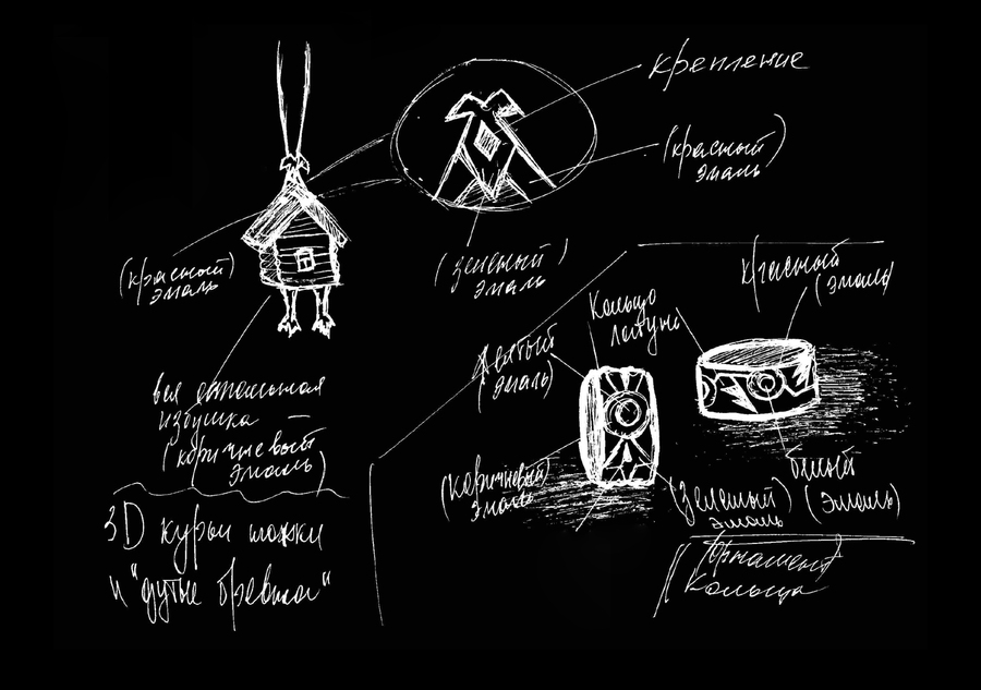 Материал — латунь, детали покрыты эмалью. Курьи ножки созданы благодаря 3D моделированию. Корпус избы выполнен из скульптурного воска, конек из воска в листах.