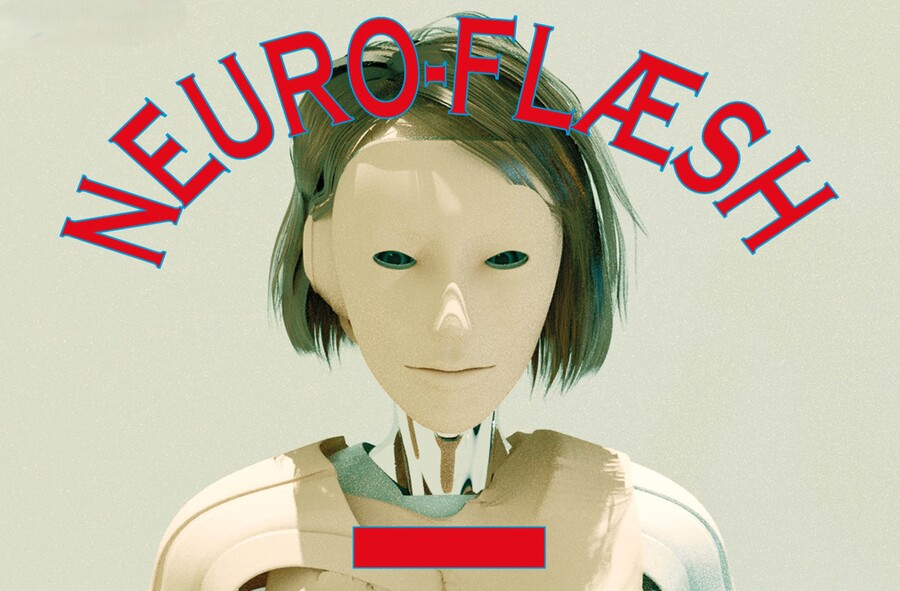 Промпт для постеров: an eclectic poster in a vibrant electric red and blue palette with bold accents and sharp outlines on the red background. The design prominently features the name of the establishment, 'Neuro-Flesh, ' in a bold, futuristic font, surrounded by flat vector geometric shapes and scanned pictures of the place. The composition captures the edgy, abandoned vibe of the venue, with paper textures and flat details