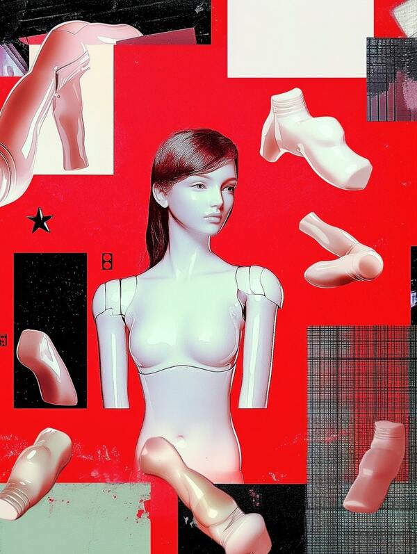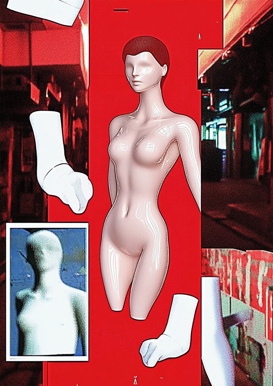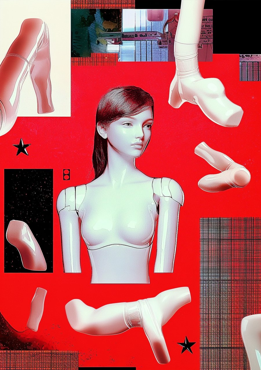 На первом этапе создания мерча появилась идея сделать сборные куклы с литниками, но подобрать нужный промпт оказалось сложнее, чем предполагалось изначально. Несмотря на это, одна из генераций с этой первой идеи послужила основным референсом стиля для следующих позиций мерча.