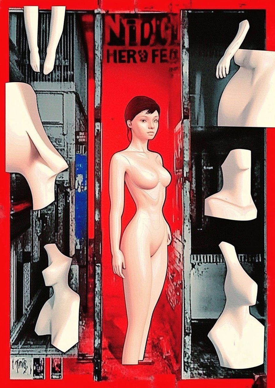 Промпт: An underground, semi-abandoned strip-bar in dystopian Japan, lit by cold, flickering neon lights in blue and white. Robotic women with sleek, glowing features sit and perform in a gritty, metallic interior. Cracked surfaces, exposed wires, and a lot of faded Japanese posters create a haunting, retro-futuristic atmosphere
