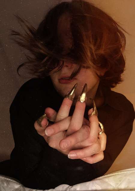 Кольца носятся на третьих фалангах пальцев, поверх ногтей, с изгибом от корня. Это соответствует анатомии когтей у животных, где коготь является непосредственным продолжением кости последней фаланги. А «неидеальная» расцарапанная текстура добавила жизни в плоский металл, оставив на нём природный отпечаток, подобный шероховатой поверхности натуральных звериных когтей.