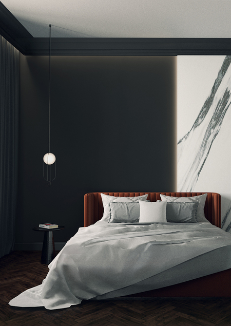 Отличительной чертой интерьера являются графичные чёрные элементы. Несмотря на преобладание нейтральных цветов в отделке, интерьер нельзя назвать безликим — преобладание вертикальных линий задает определенный ритм помещения, а темны карнизы и плинтусы подчеркивают его.