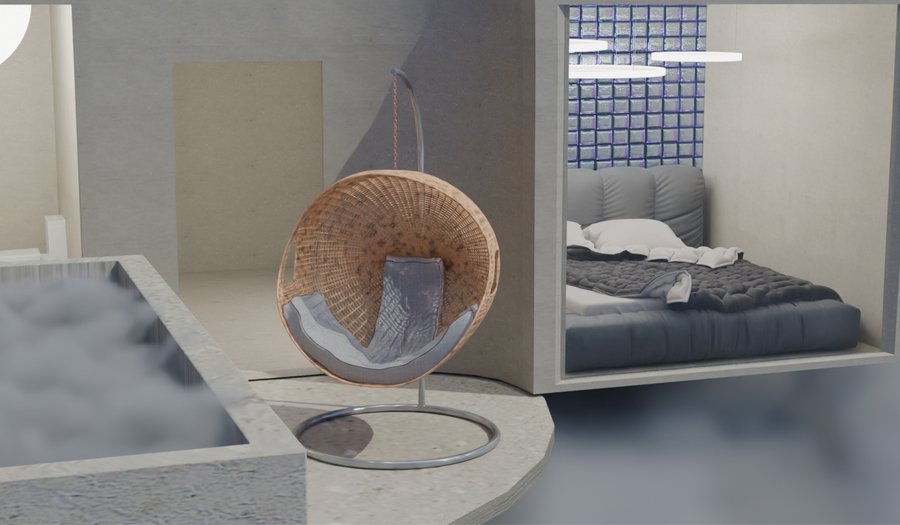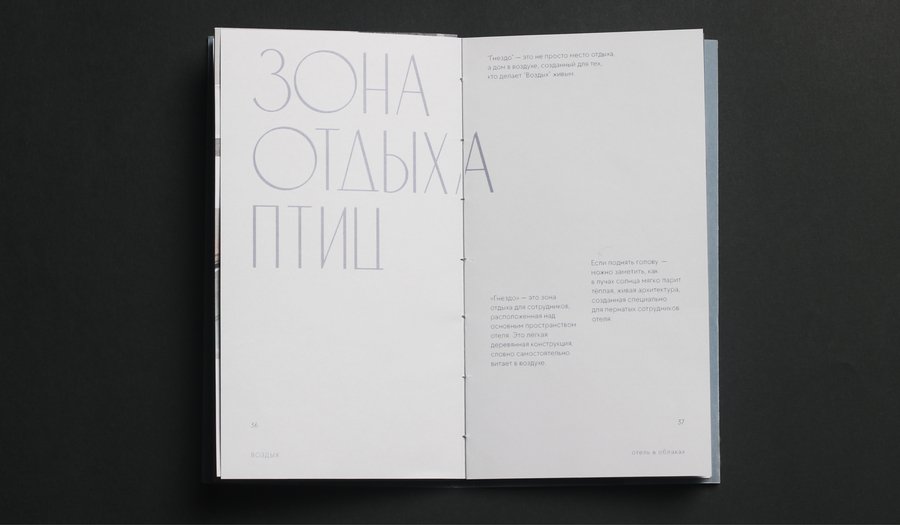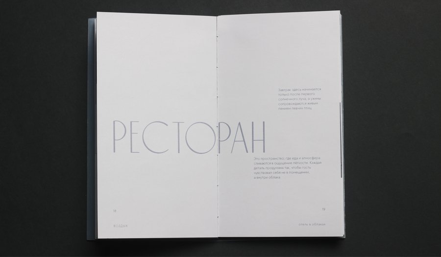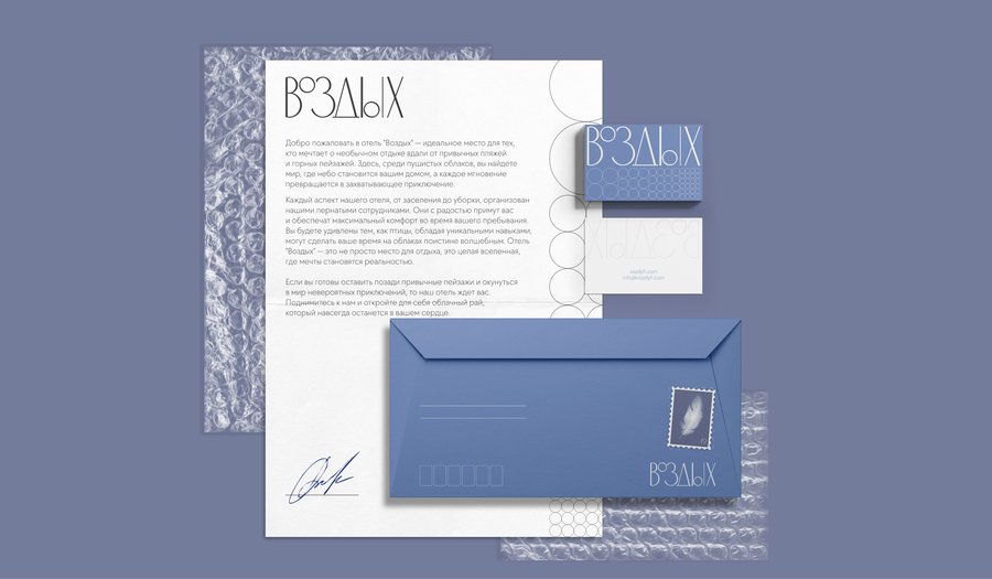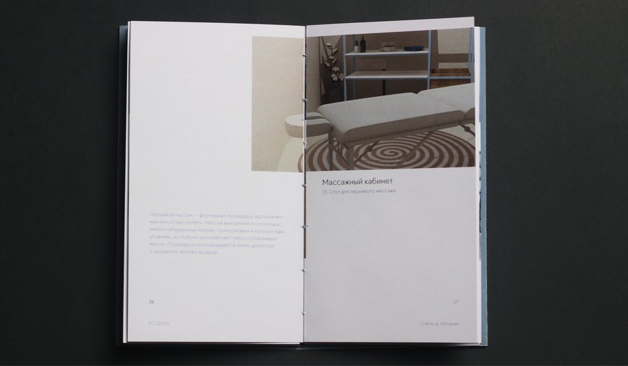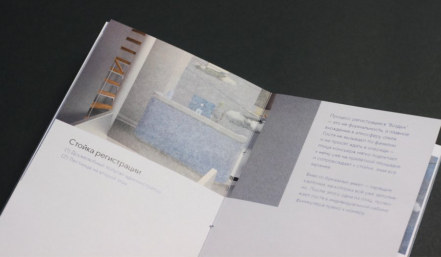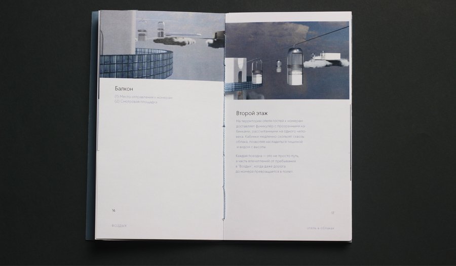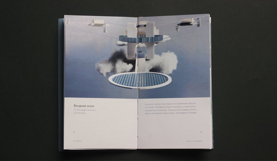 Каждая зона отеля — от прилётной площадки до номеров и ресторанов — проектируется как самостоятельный облачный «остров», объединённый общим визуальным и смысловым ритмом. Пространства соединены лёгкими переходами, фуникулёрами и мостами, создающими ощущение полёта. В интерьере преобладают светлые оттенки, прозрачные и полупрозрачные материалы, усиливающие иллюзию парения. Пространство отеля не диктует маршрут, а мягко направляет, создавая интуитивную и ненавязчивую навигацию. Функциональные зоны отделены не стенами, а воздухом, светом и туманом, что позволяет сохранять приватность, не нарушая общей целостности пространства. Вся архитектура «Воздых» построена вокруг идеи: отдых начинается там, где заканчивается ощущение тяжести.