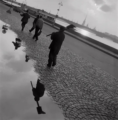 Ленинград — это город на воде, но также и «каменные джунги». Вся жизнь города и его жителей проходит рядом с водой, которая, будто делает Ленинград более гармоничным и подвижным на фоне застывших дворцов и многовековой истории. Мы видим, как не только смысловая контрастность проявляется в фотографиях, но и цветовая: это часто мягкие белые оттенки, как снег, небо или вода, и жесткие серые или черные, как асфальт, дворцы и каменные плиты, а иногда и сами люди, соединяющиеся в толпу. Тема контраста отлично раскрывает Петербург, показывая не только его холодную сторону, но и легкость с другой стороны, и всё это делит лишь одна линия контраста.