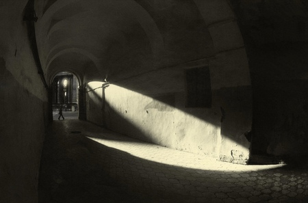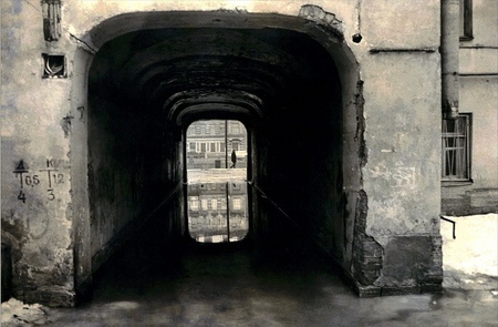 Регулярной темой искусства Петербурга являются его бесконечные арки, проходы и замкнутость, которые создают ощущение давления. Однако, где есть начало пути, всегда есть и его конец. Каменные плиты, соединяясь друг с другом, создают иллюзию нахождения в пространстве, которое будто переносит нас в другое измерение. Таким образом, пропасть может символично отражать запутанность состояния души, которую можно преодолеть. Из темноты пропасти всегда есть возможность выбраться в светлое будущее.