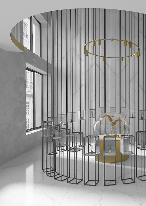 Экспозиция первого этаж состоит из открывающихся стендов для парфюмерии и круглой тумбы с шарообразным прозрачным куполом для сезонных композиций. Геометрия основана на окружностях, что отсылает к парфюмерной тематике — молекулам. Свое продолжение округлые формы находят в залах второго этажа.