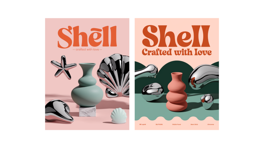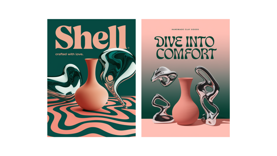 1. https://ideogram.ai/ Prompt: Create an appealing advertising poster for a handmade clay goods. Add big heading «shell — crafted with love». Font should be undulating, organic curves, wavey. Use pastel pink and green colors and amorphous chrome shapes that resemble marine theme. In the center of the poster there is a curvy clay vase. Poster in a Swiss style.