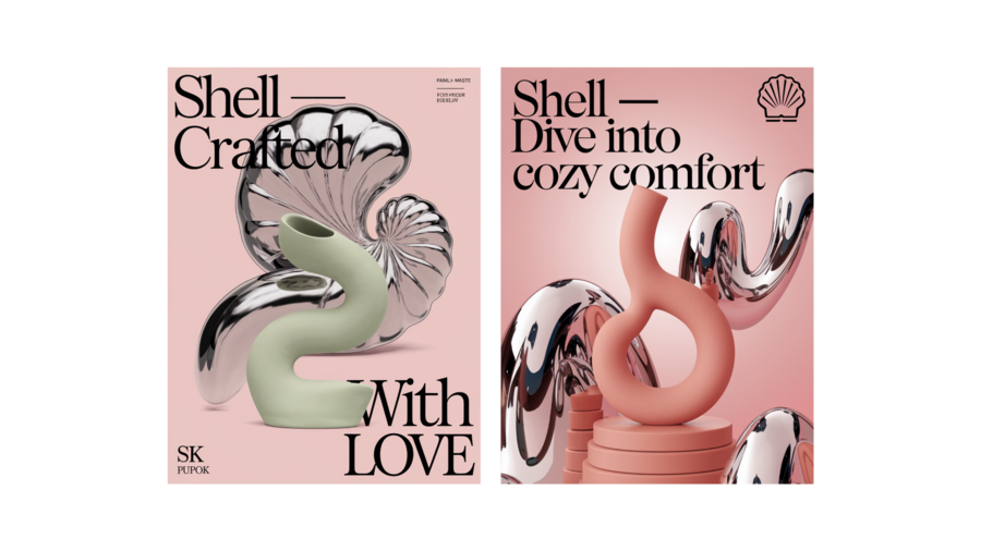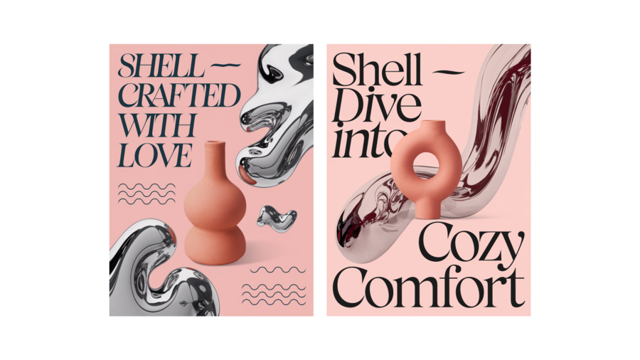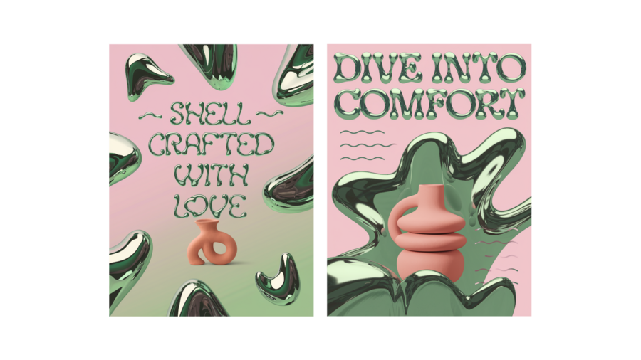 2. https://ideogram.ai/ Prompt: Create an appealing advertising poster for a handmade clay goods. Add big heading «shell — dive into comfort». Font should be undulating, organic curves, wavey. Use pastel pink and green colors and amorphous chrome shapes that resemble marine theme. In the center of the poster there is a curvy clay vase. Poster in a Swiss style.