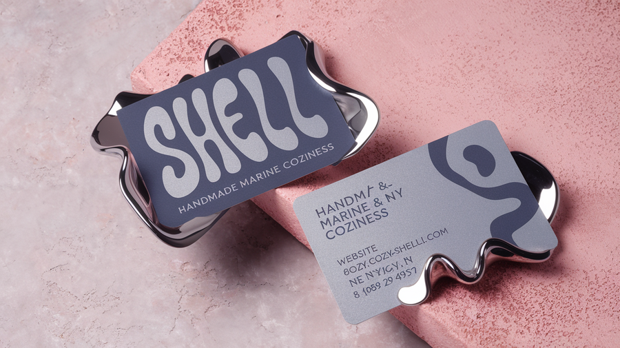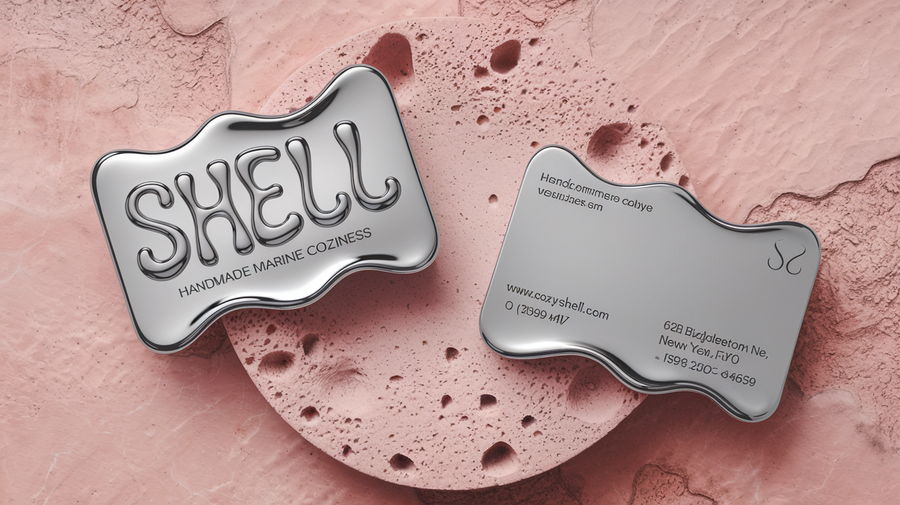 https://ideogram.ai/ Prompt: A modern trendy business card for a store of handmade clay goods for home called «shell». The business card is shown from two sides. The business card is silver chrome glossy with wavy amorphous undulating edges. It is placed on a pink smooth concrete with a natural texture. On the front side of the business card, there is a big heading «shell» with a wavy undulating font. Under it, there is a text «handmade marine coziness». On the back side, there are some information: website «www.cozy-shell.com», address «626 Bridgeton Ave. New York, NY 10029», and phone number «8 (800) 296 4697».