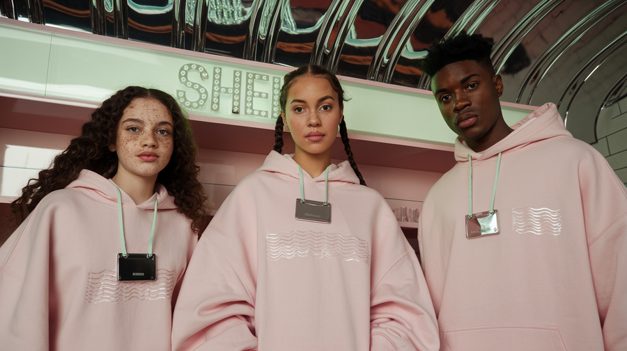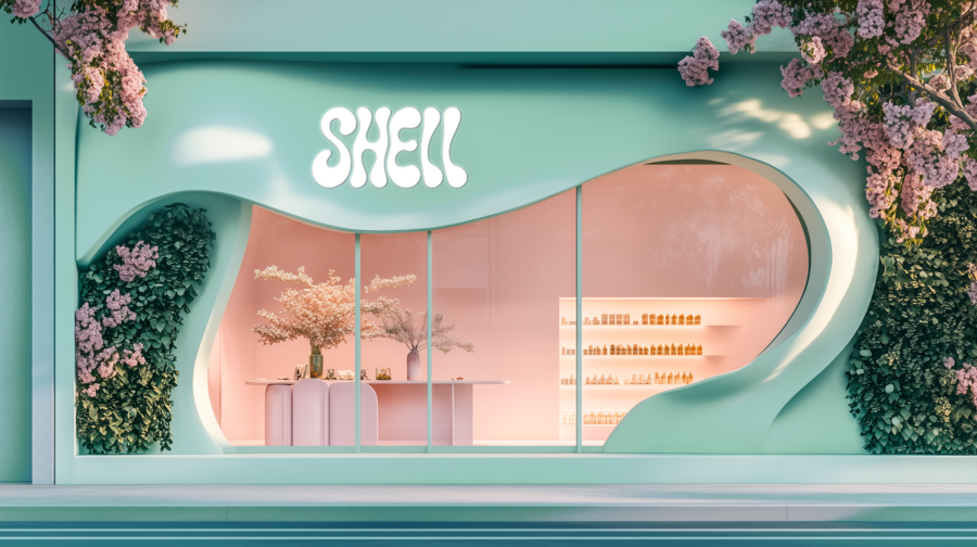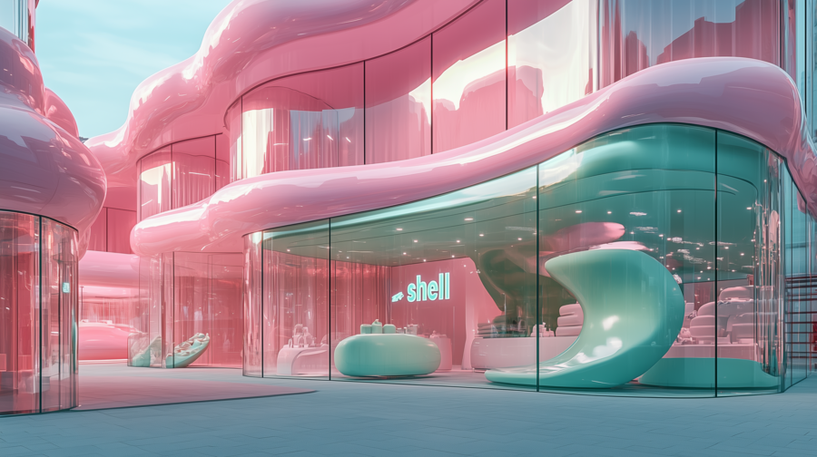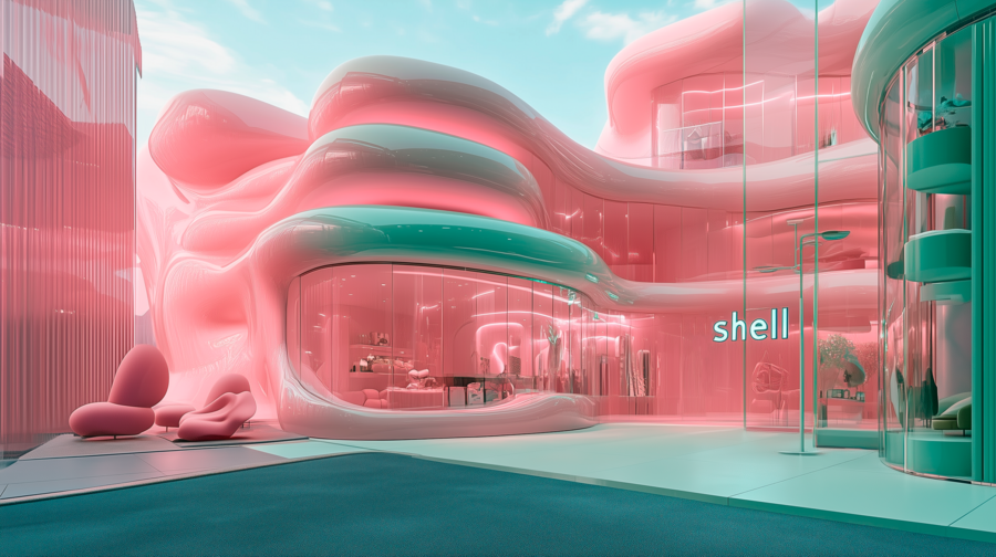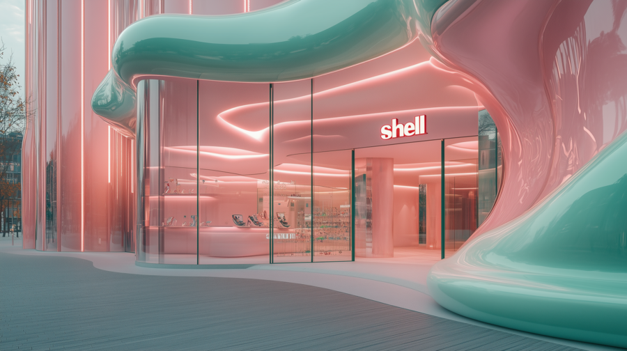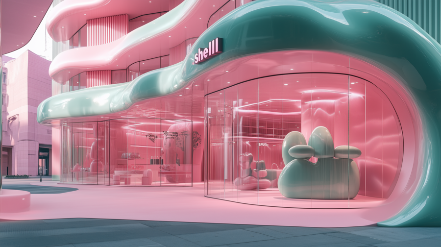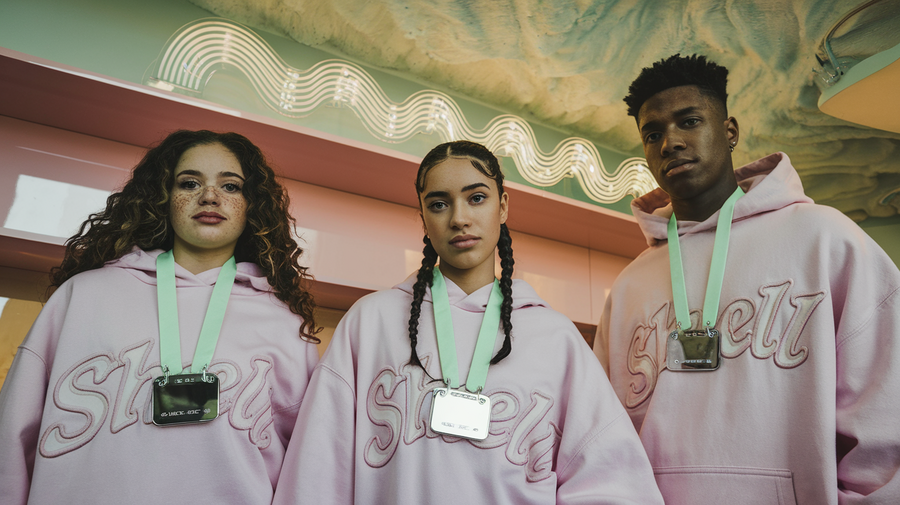 https://ideogram.ai/ Prompt: A photo of three employees in a uniform. There are two young girls: one of them has curly hair and freckles and the other one has her hair in two braids. There is also a young black guy. They are all wearing oversized pastel pink hoodies with the text «shell» written in an undulating font. They also wear chrome name tags on their necks. The background contains a glossy pastel pink shelf and a luminous undulating wavy signboard «shell». The ceiling is chrome and resembles ocean waves. The lighting is warm.